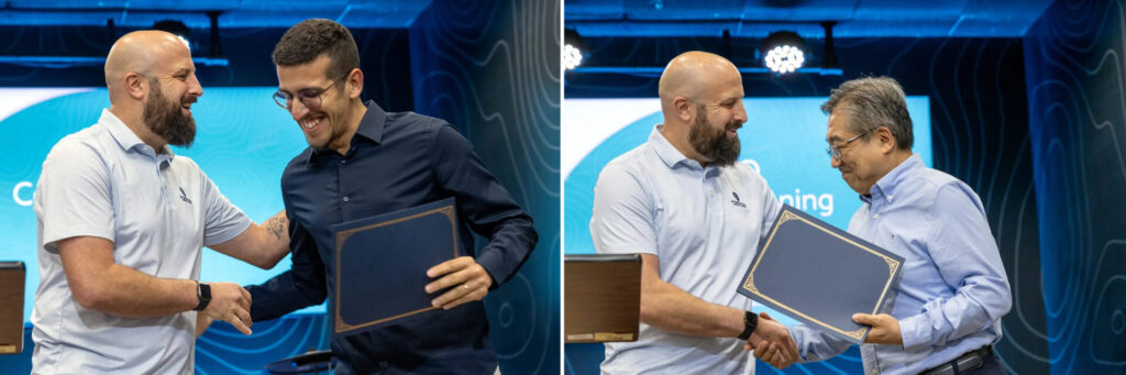 Jacob Boss, IMB vice president for Global Engagement, recognizes Francisco Aires Júnior, Brazilian Junta de Missões Nacionais’ manager of missionary formation and strategy (left), and Won Jang Joo, deputy director of the World Training Center for Korean Foreign Mission Board (right), during the IMB’s September commissioning service. IMB Photo