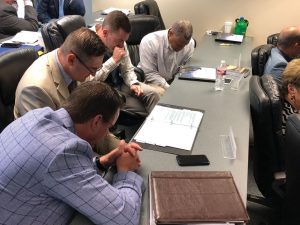 Board members, from left, Michael Staton, Mustang, First; Philip Stephens, Durant, First; Heath Tucker, Skiatook, First; and LeRon West, Tulsa, Gilcrease Hills, spend time in prayer during May 22 session.