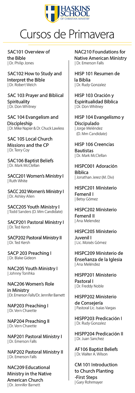 La Escuela Haskins añadió los nuevos cursos de: Panorama de la Biblia, Dr. Rudy Gonzalez; Creencias Bautistas, Dr. Mark McClellan; Adoración Bíblica, Jonathan Jerez; Ministerio a Mujeres II, Ana Melendez, en el Otoño 2018. El curso de Ministerio a Mujeres es de 7 semanas y es un inicio de varios cursos de 7 semanas que serán ofrecidos el próximo año. La Escuela anticipa finalizar el desarrollo de todos los cursos de ambos diplomas, Ministerio Pastoral y Ministerio de la Iglesia, para el septiembre, 2019.