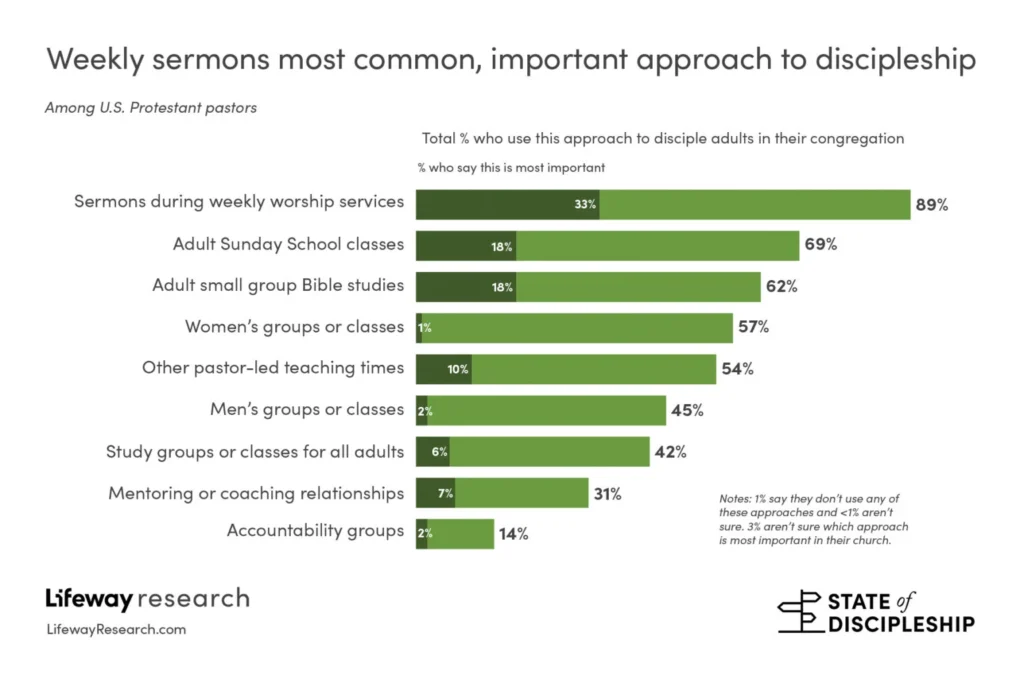 “There is a clear discrepancy in the discipleship thinking of many pastors,” said McConnell. “Seven in 10 say discipleship is most effective with close relationships, but a third say their large group sermons are the top discipling ministry of their church. While preaching is definitely a biblical activity required of pastors that can encourage sound doctrine and unity, good discipleship requires just as much intentionality in relational approaches to discipleship.”