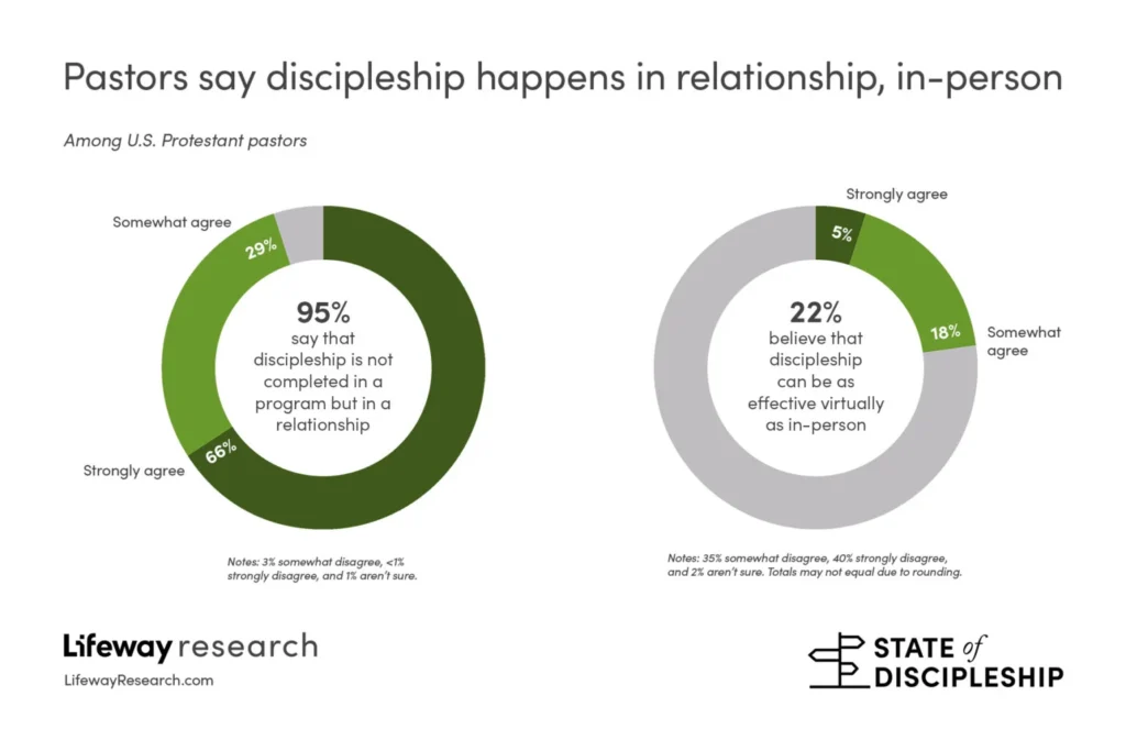 However churches seek to help their people grow spiritually, pastors believe that growth will happen best with other people involved. Almost all (95%) say discipleship is not completed in a program but in a relationship. Most believe that disciple-making relationships must include physical presence. Only 22% believe discipleship can be as effective virtually as in-person, while 3 in 4 (75%) disagree.