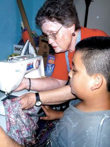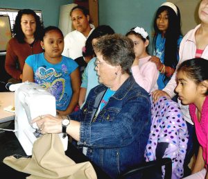 Bonita Watts helps a student with a sewing project.