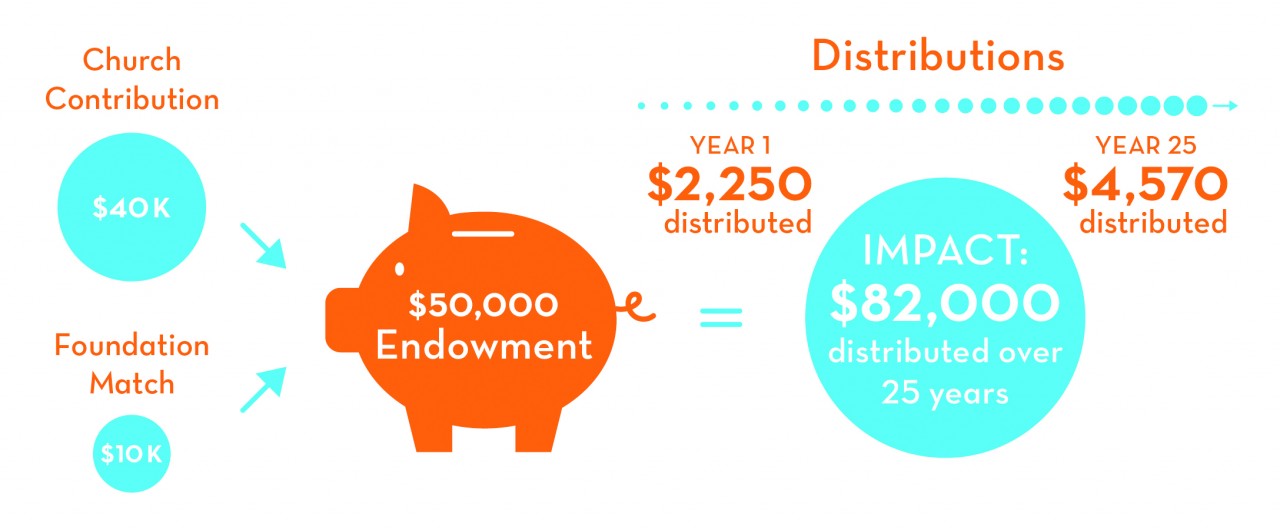 For example, if a church took advantage of the full match and placed $40,000 into an endowment, the Foundation would provide an additional $10,000, for a total of $50,000. In 25 years, that $50,000 endowment would grow to double its annual distribution from $2,250 to $4,570. Cumulative annual distributions over the 25-year period would total $82,000, more than $30,000 above the original $50,000 endowment.